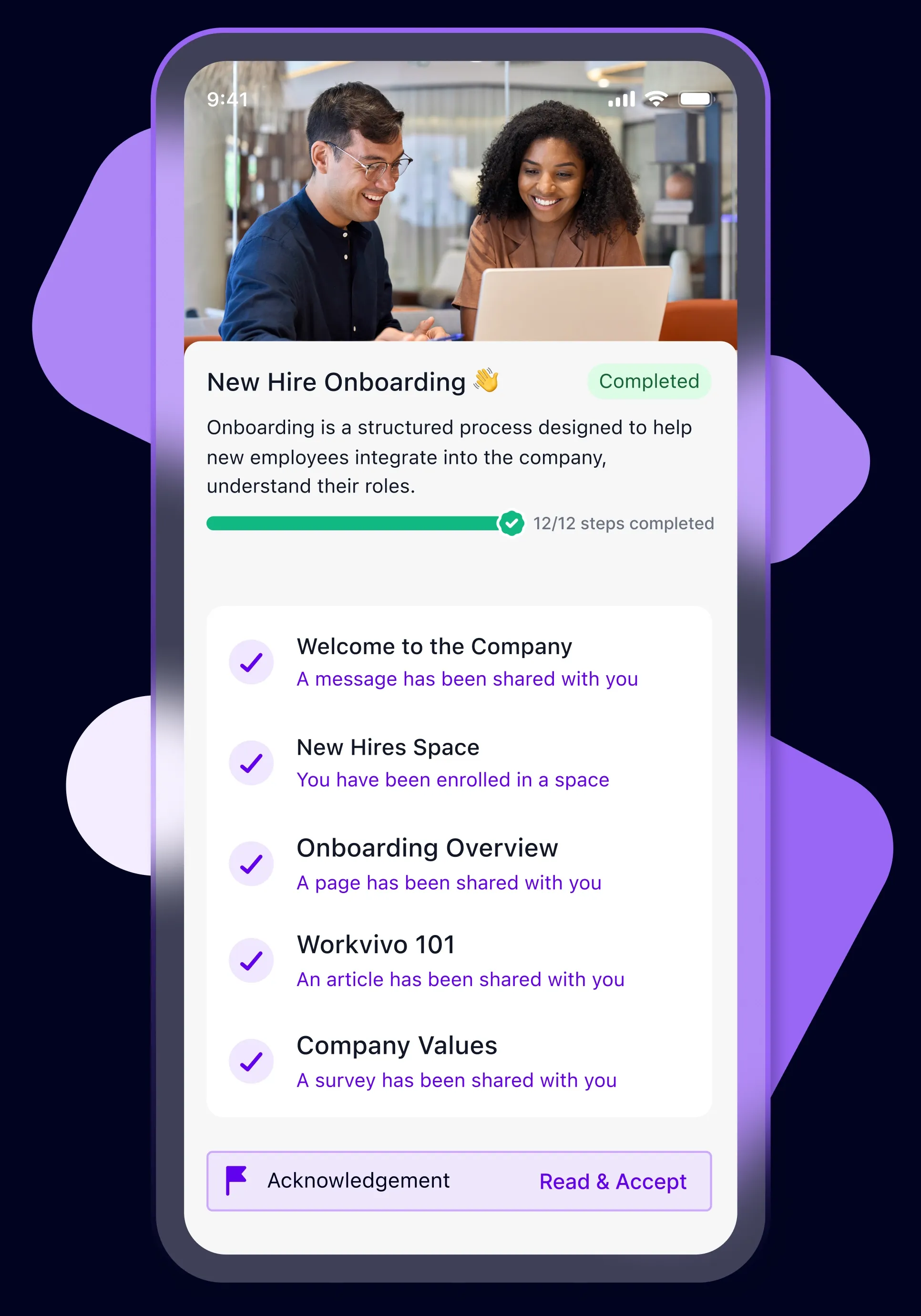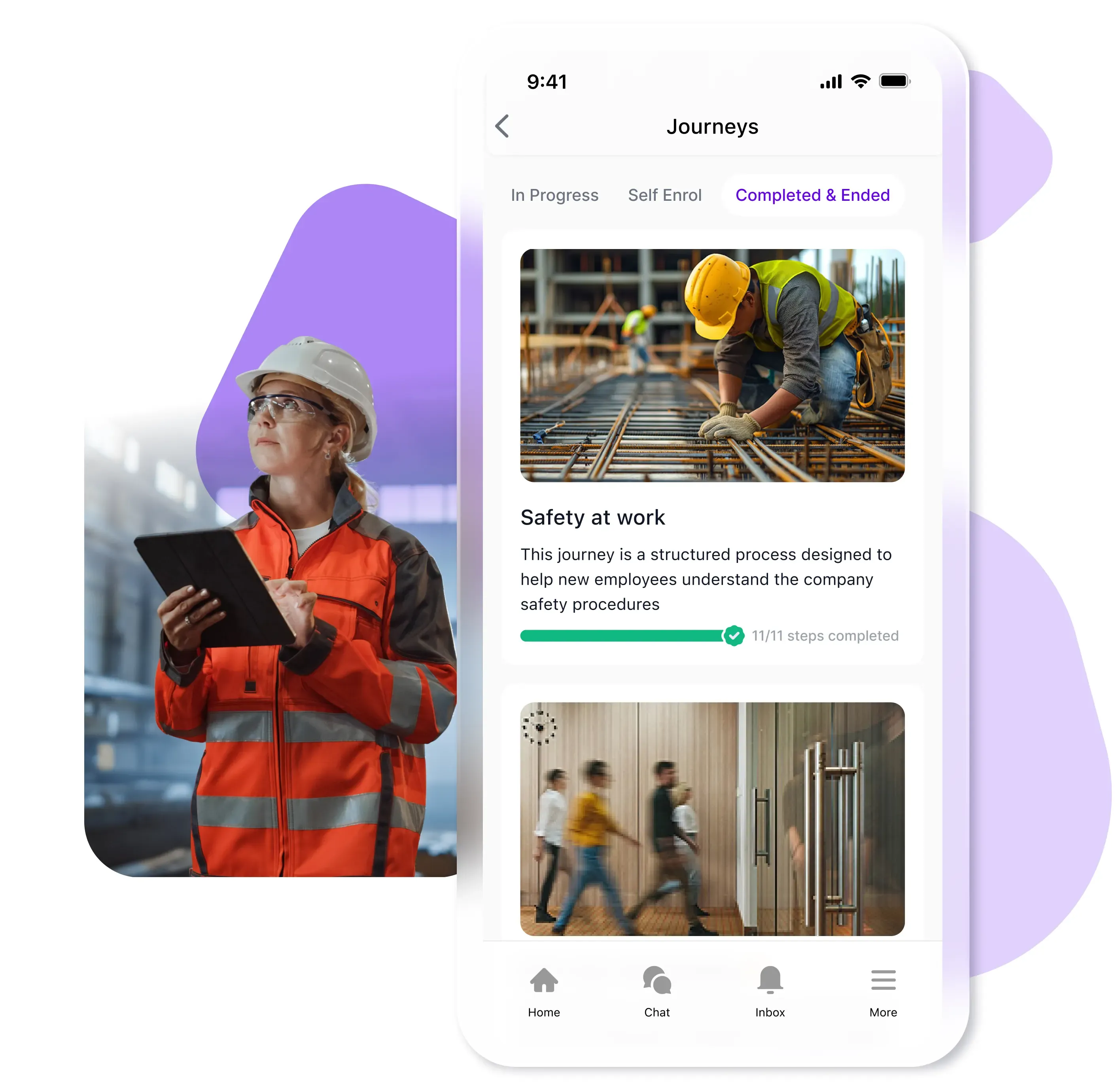 Whether your people are on the frontline, the field, or at their desks, they can view, progress and complete Journeys right from the Workvivo mobile app.