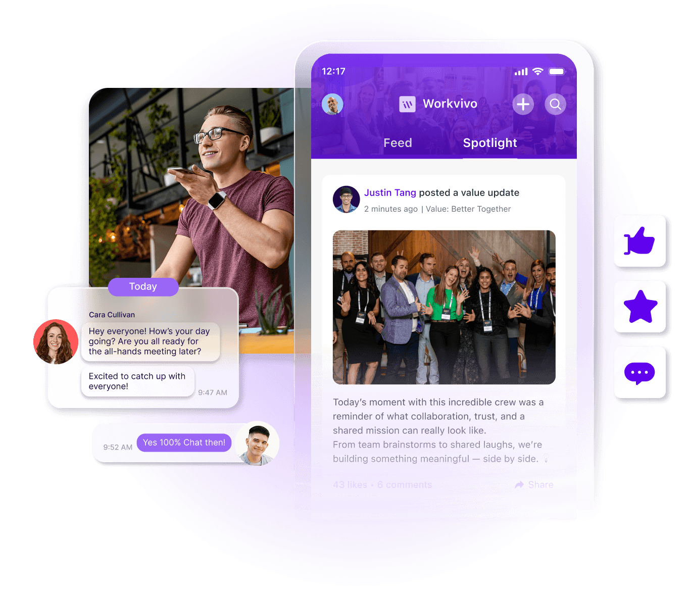 Egal, ob du wichtige Updates teilst oder alle für deine neueste Kampagne begeistern möchtest: Workvivo verhilft dir zu einer einheitlichen und ansprechenden Kommunikation, die außergewöhnliche Mitarbeitererlebnisse fördert und die Unternehmenskultur auf allen Ebenen verbessert.