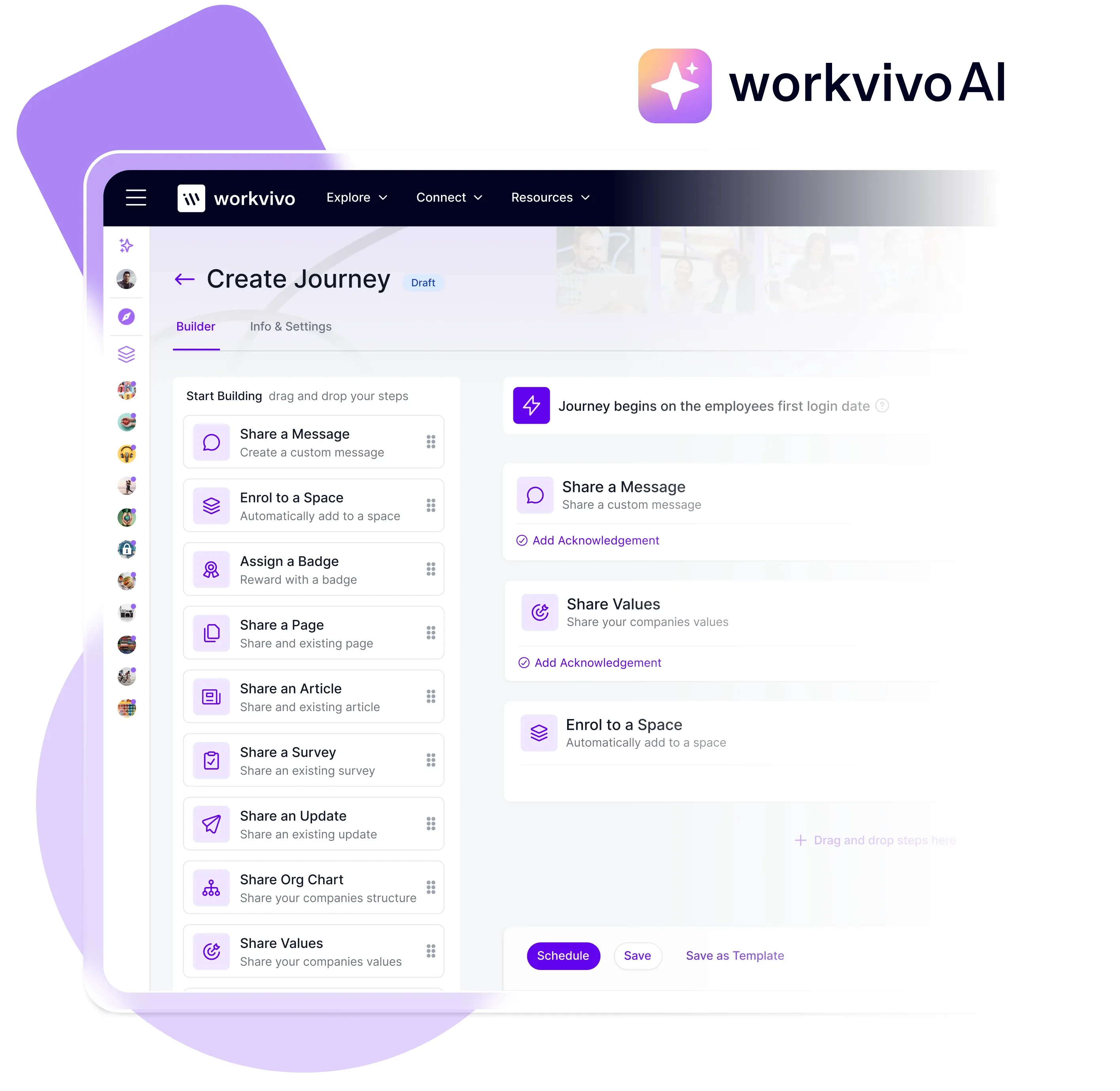 Workvivo Journeys helps Enterprise organizations design and automate personalized experiences that connect communications, culture, and operations, in one seamless flow.