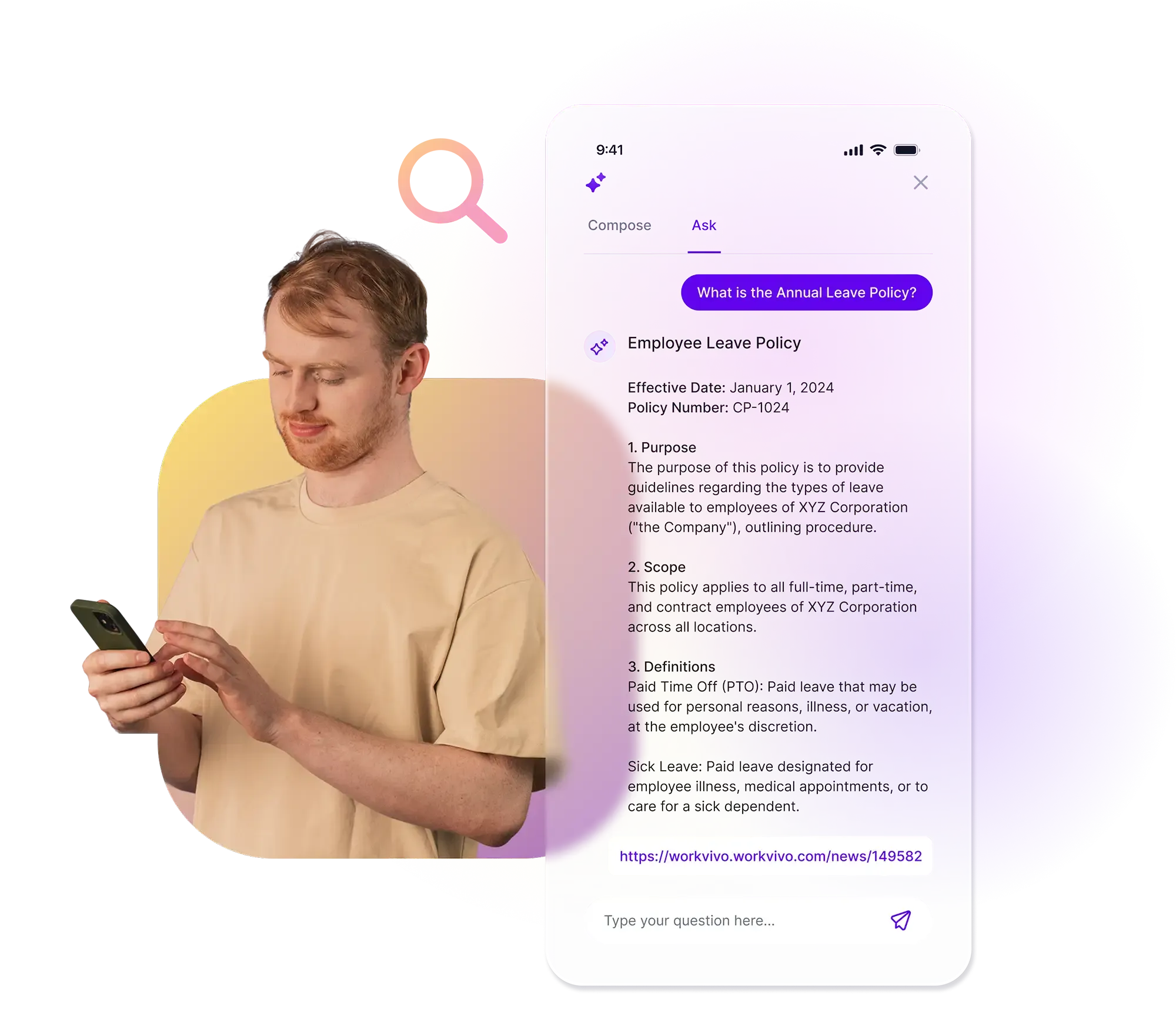 Work smarter, faster, and more effectively, with Workvivo AI. Whether you’re writing company updates, finding answers or creating surveys, Workvivo AI adapts instantly to deliver the right support, exactly when and where you need it.