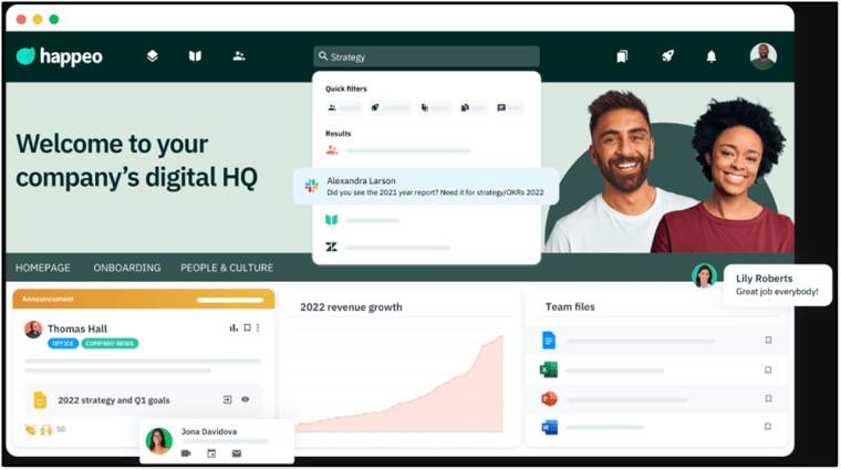 Happeo came up often in our research as a solid choice for companies heavily invested in Google Workspace. Teams can move across Gmail, Drive, and Slack from one search bar, which solves that constant tab-switching problem.