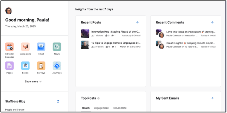 Side note → If timing matters for your updates, look for platforms with intelligent scheduling. Workvivo, for example, lets you schedule content for specific times and target different employee groups.