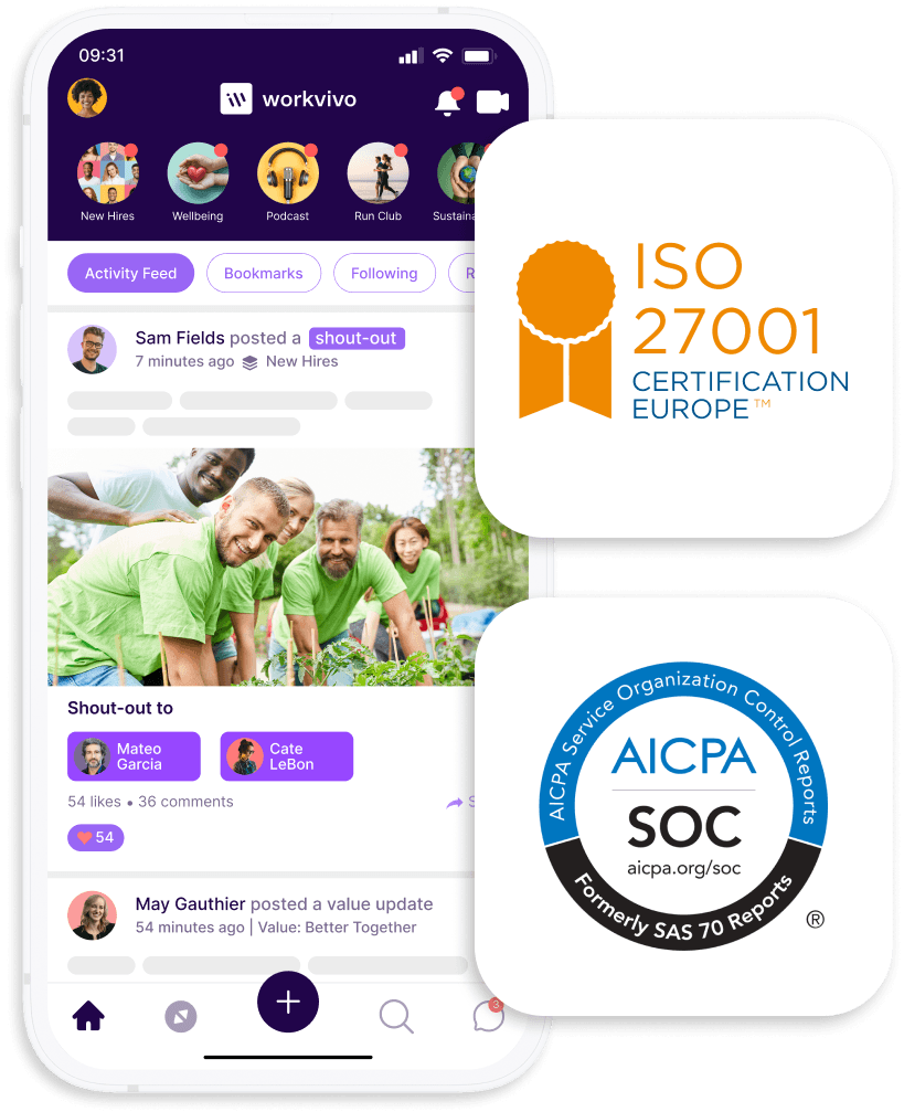 Workvivo is an all-in-one central hub where employees connect, share files and updates, and find information instantly, all protected by bank-level security that satisfies your strictest compliance requirements.