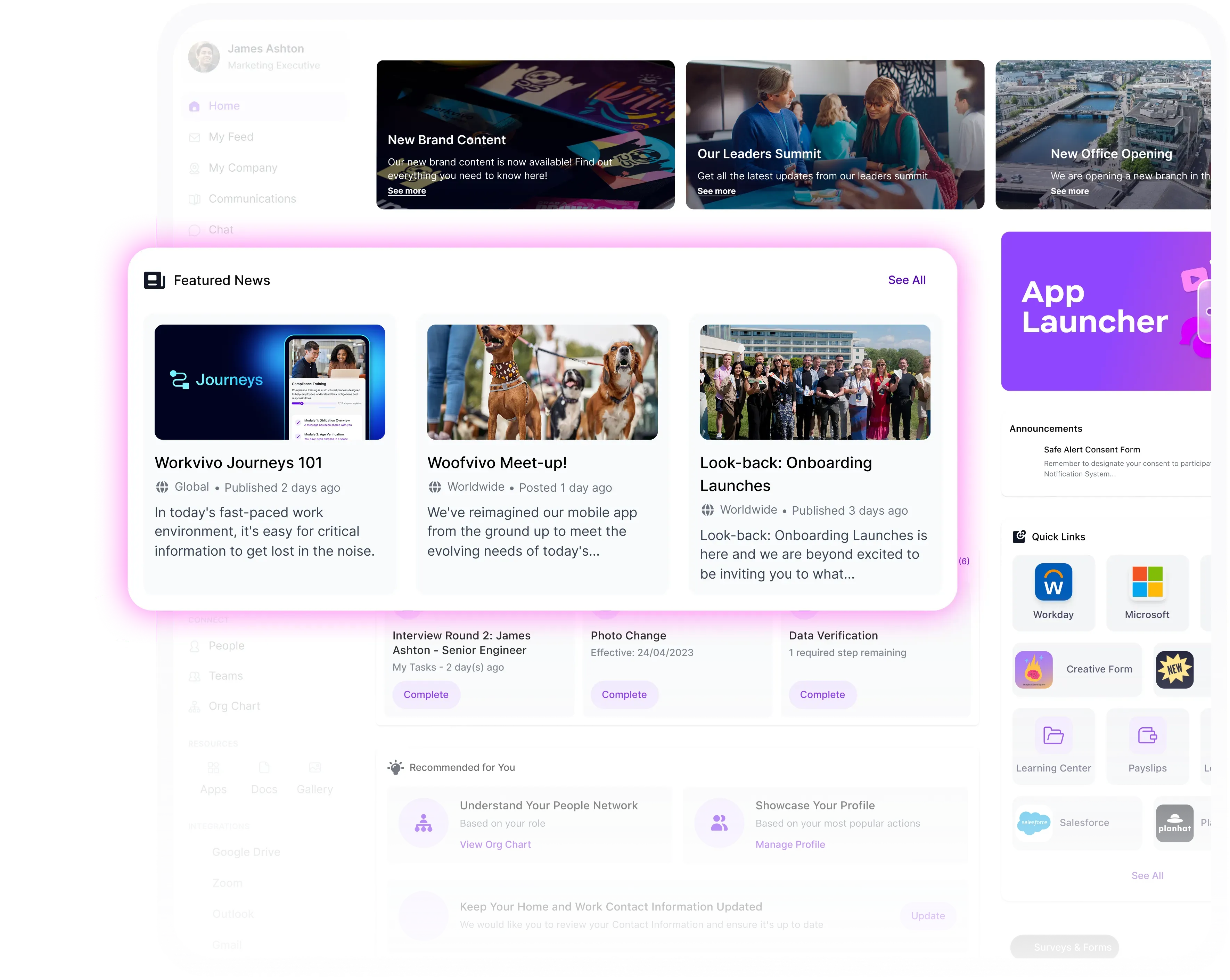 Workvivo sits on top of your existing tech stack; Zoom, Microsoft 365, Google, ServiceNow, Workday and more, unifying fragmented systems into one governed digital workplace.