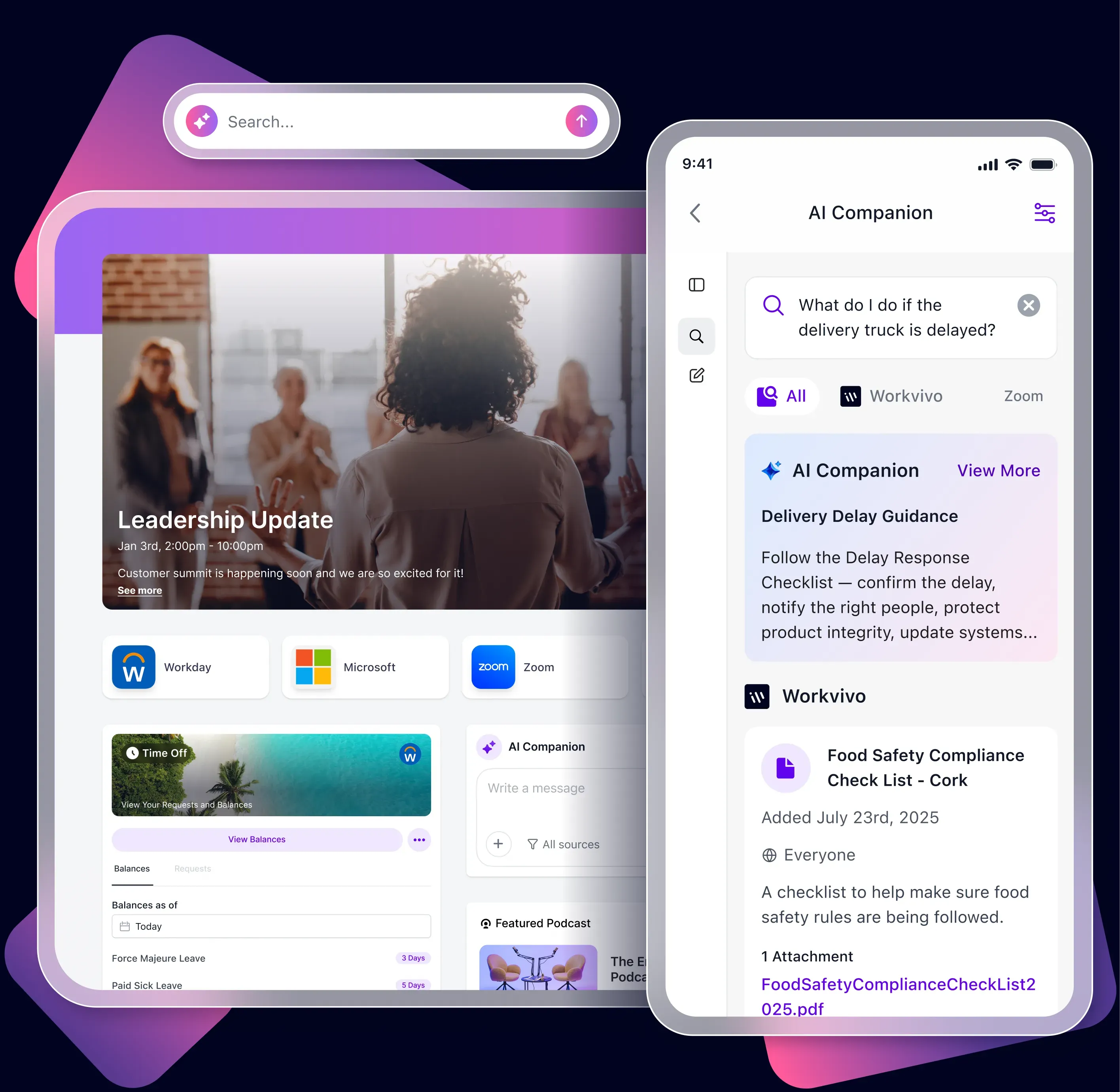 Workvivo embeds Zoom AI Companion at the infrastructure level — not bolted on. Federated search across your entire stack with zero data leakage.
