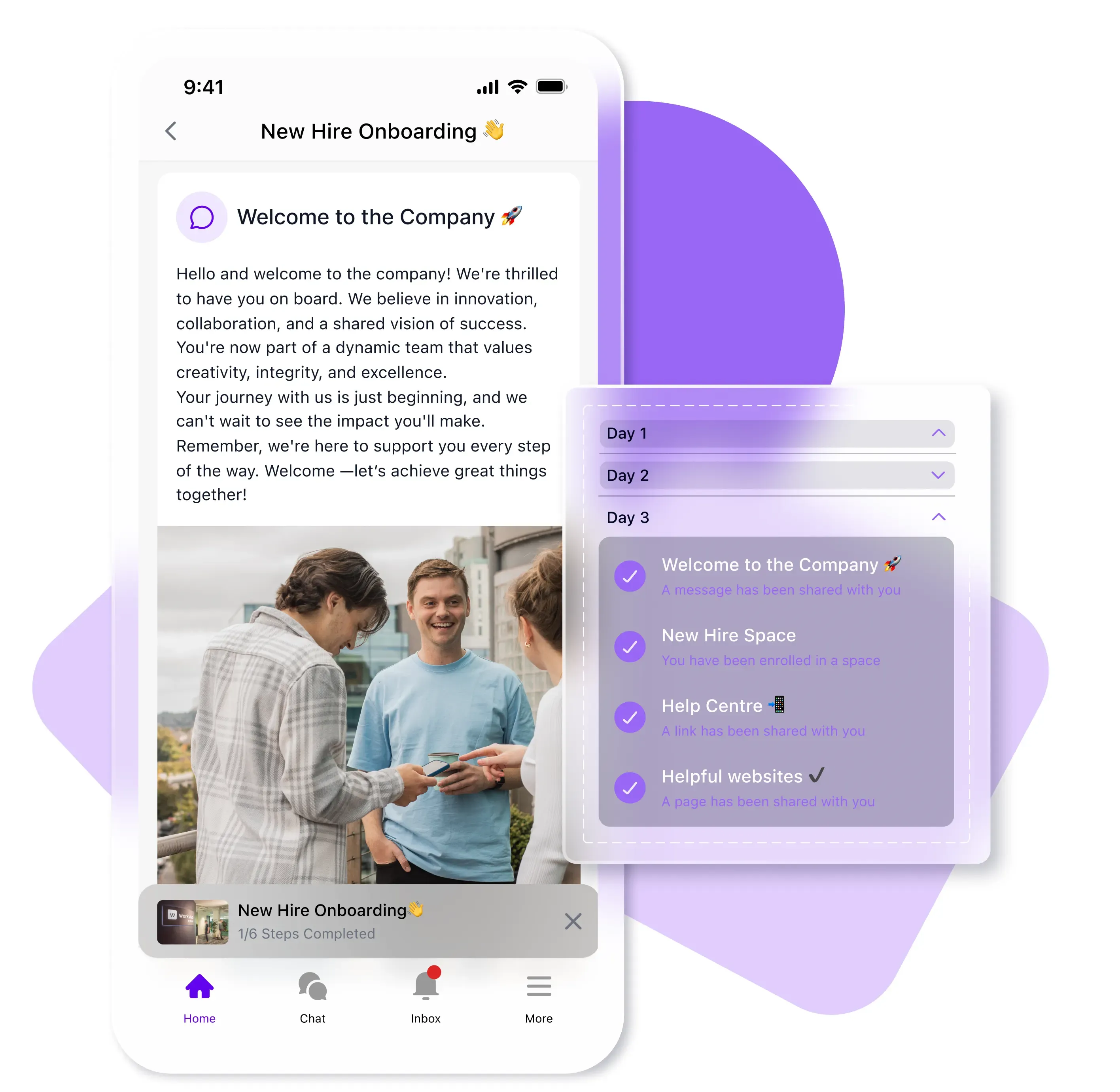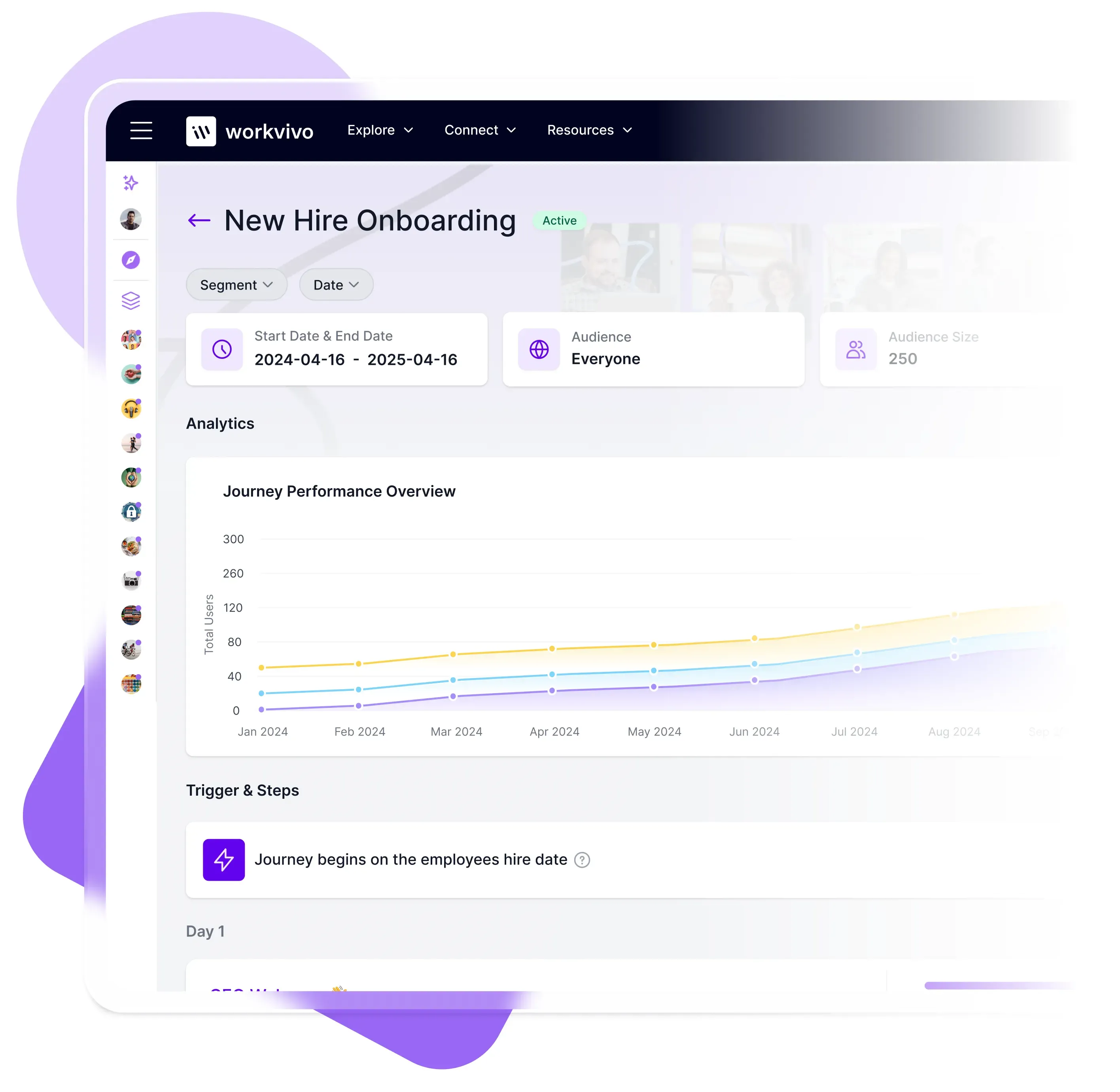 Trigger experiences automatically by start date, group, or department to ensure every new hire gets consistent, personalized support from day one.