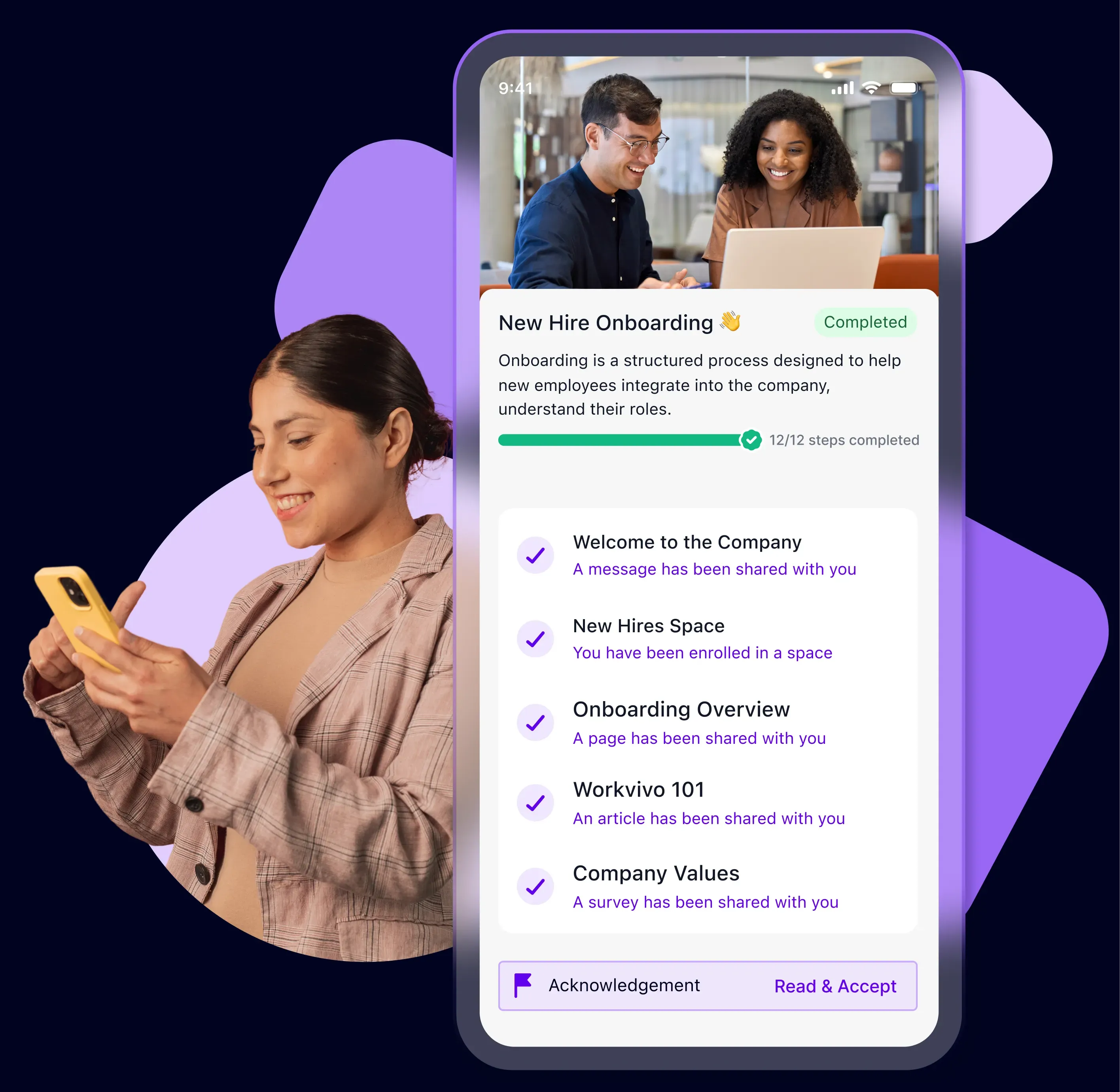 Whether your people are on the frontline, the field, or at their desks, they can view, progress and complete Journeys right from the Workvivo mobile app.